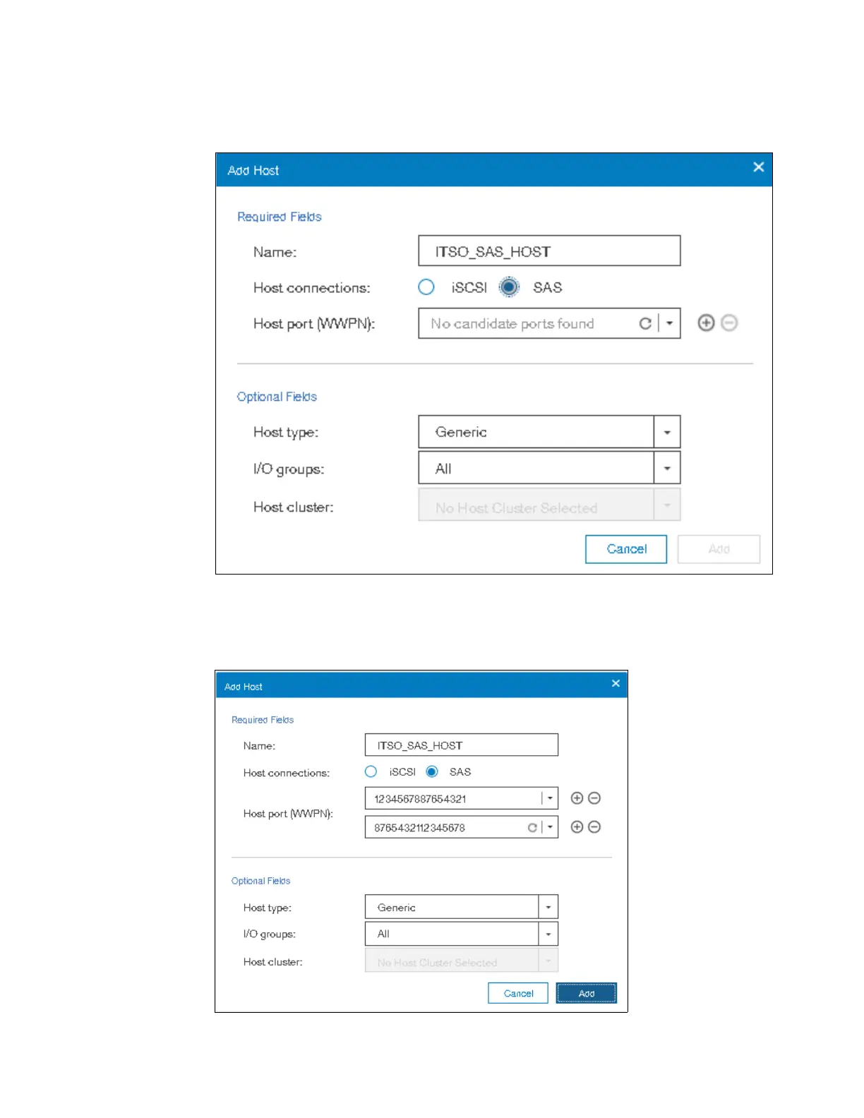 2. Enter a descriptive host name and click SAS under Host Connections option, as shown