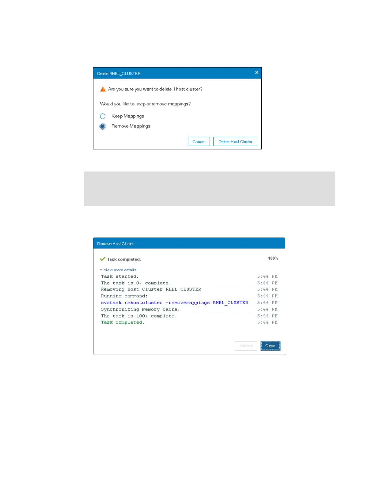 5. Click Delete Host Cluster.You see a window indicating that the task completed