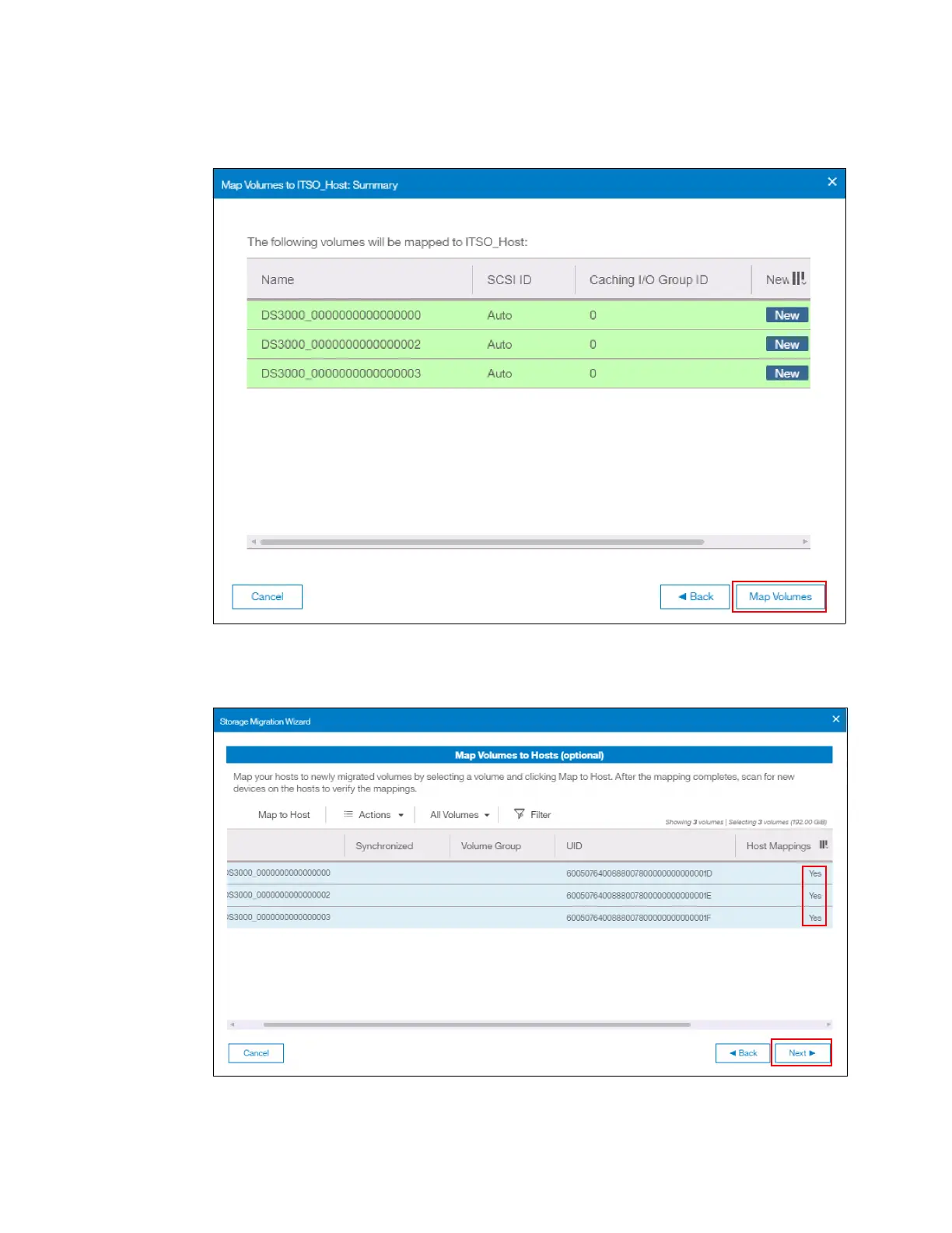 5. Figure 7-24 shows that the host mappings are in place for the chosen volumes. Click Next.