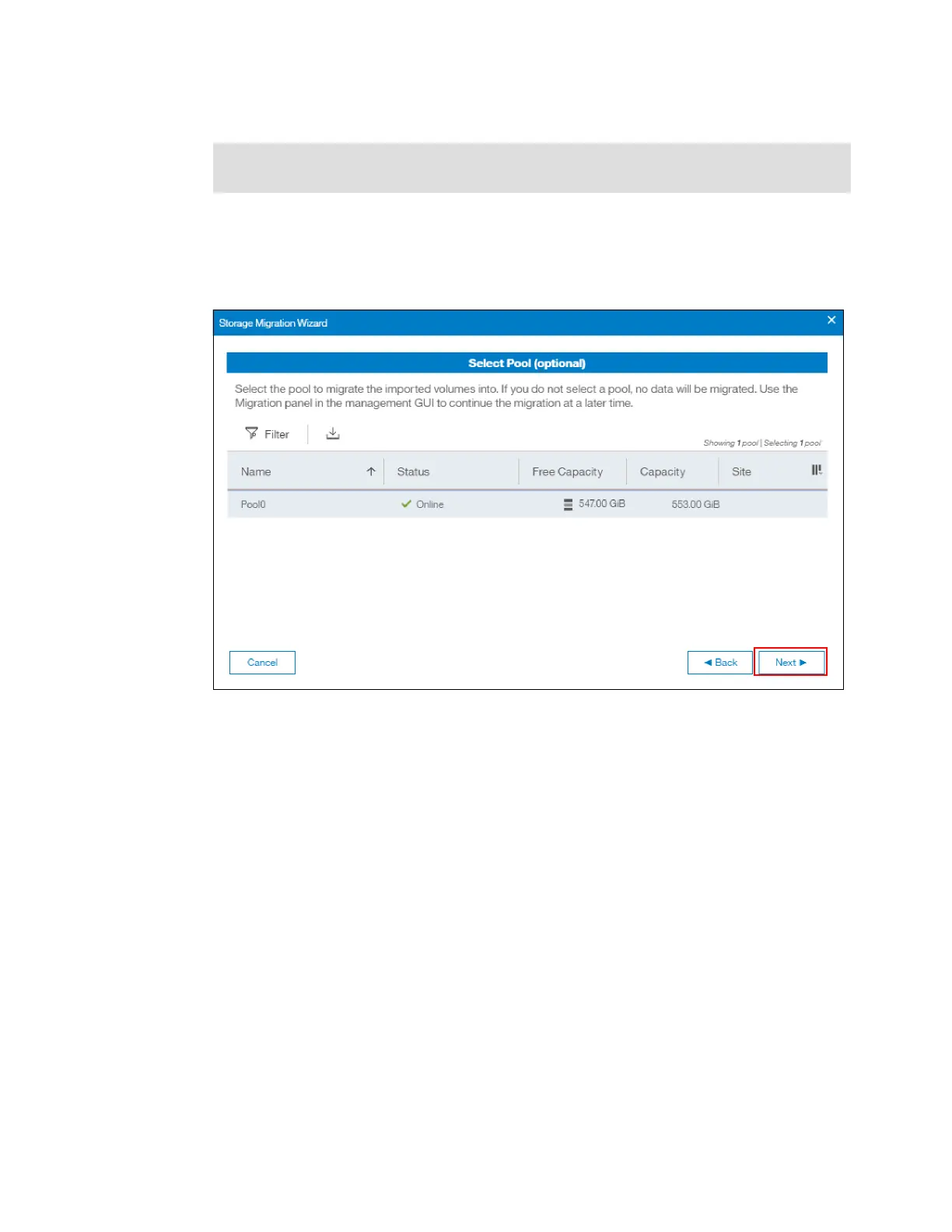 To continue with the storage migration wizard, select a storage pool to migrate the imported