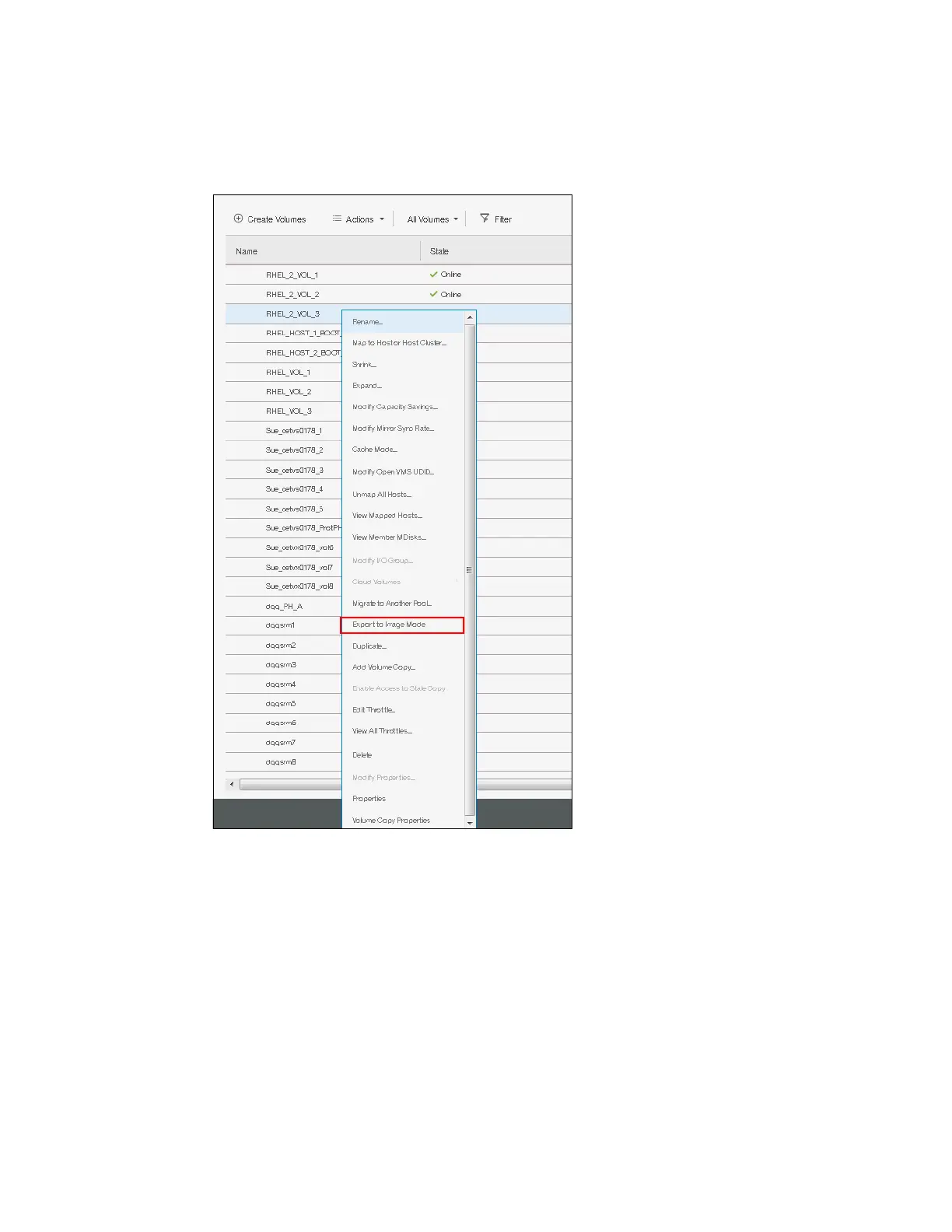 1. Select the volume that you want. From the Actions menu, choose Export to Image Mode,