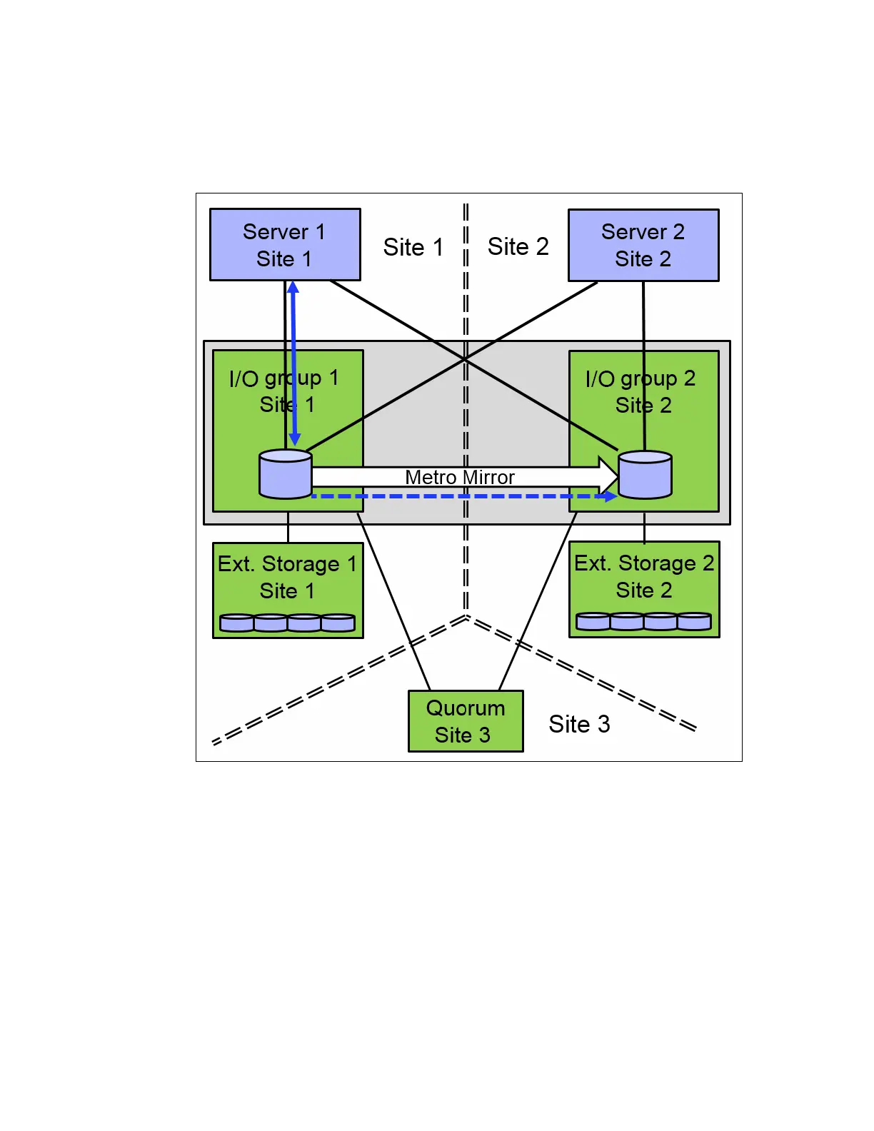 The host reads and writes data to the local I/O group within the same site. The HyperSwap