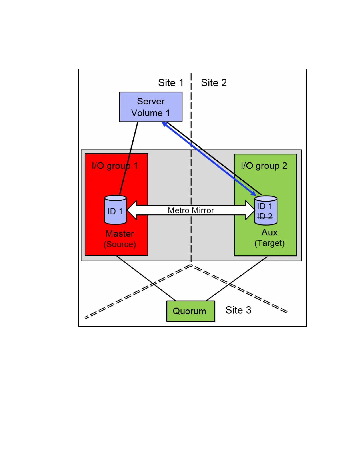 If an I/O group fails, the host can use the second I/O group at the remote site, as shown in