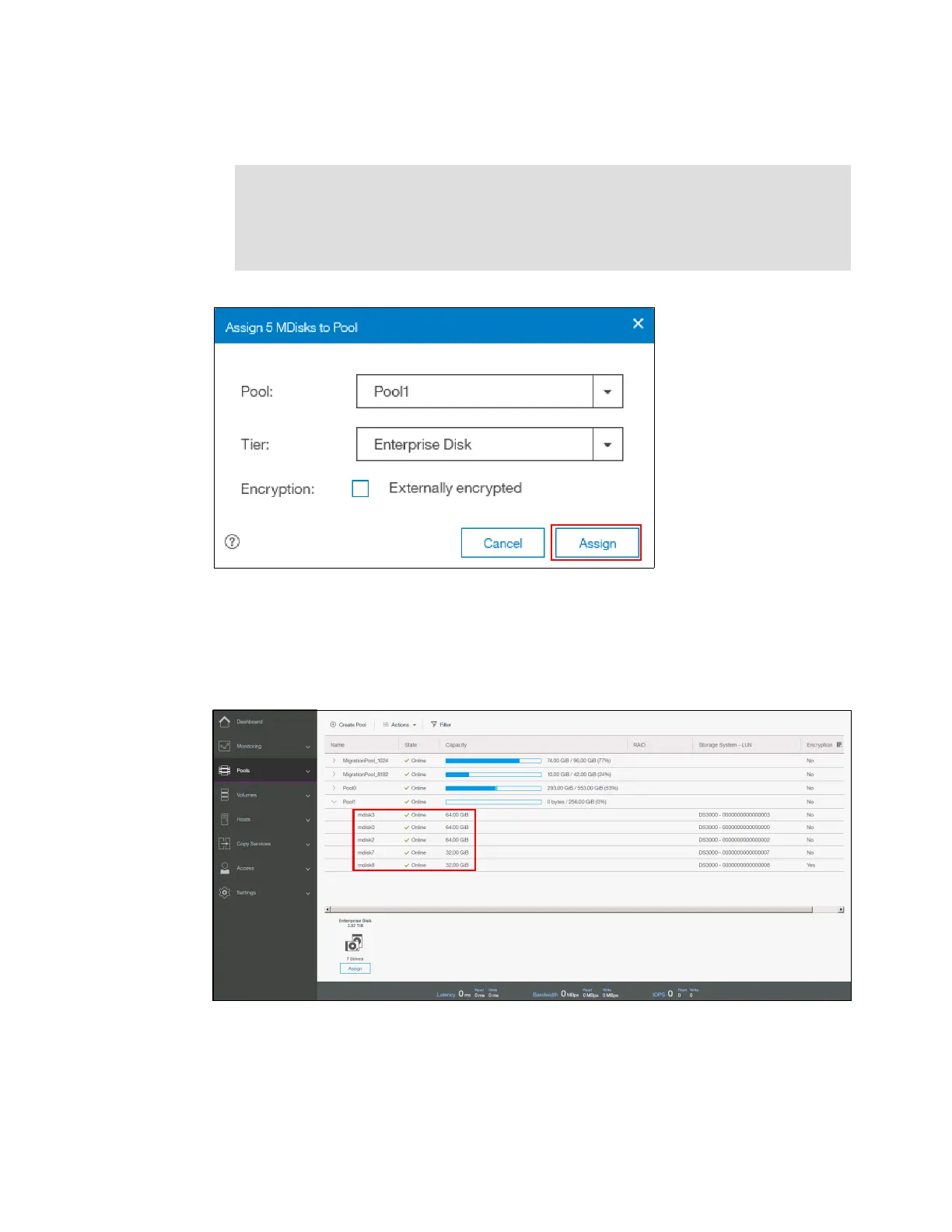 12.Add the MDisks to the pool. Select the pool to which the MDisks are going to be assigned