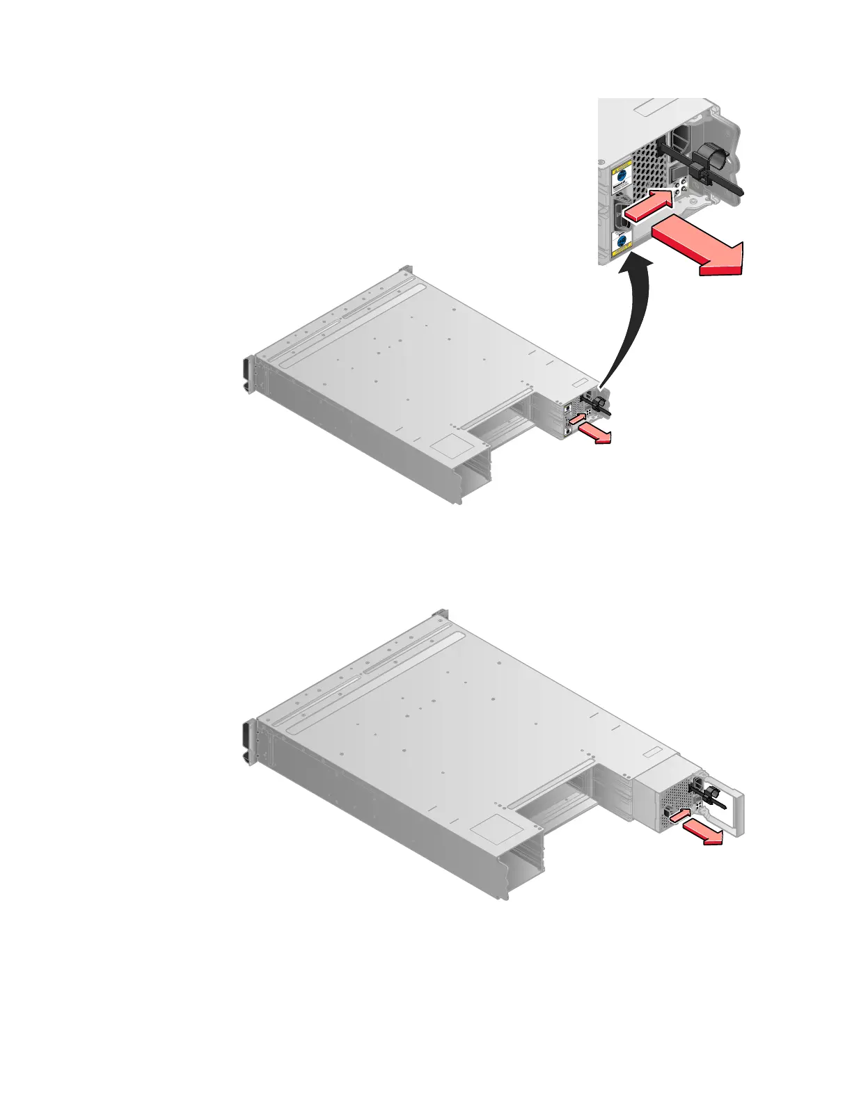 b. Grip the handle to pull the power supply out of the enclosure as shown in