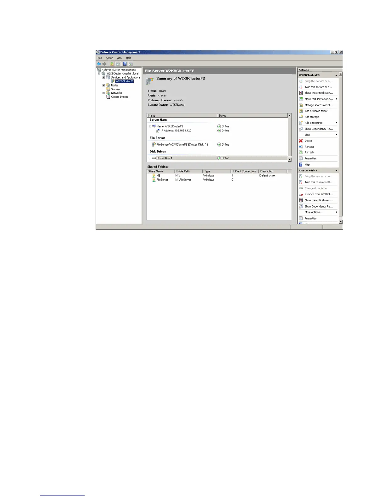 You can observe the status changes in the center pane of the snap-in as the clustered file