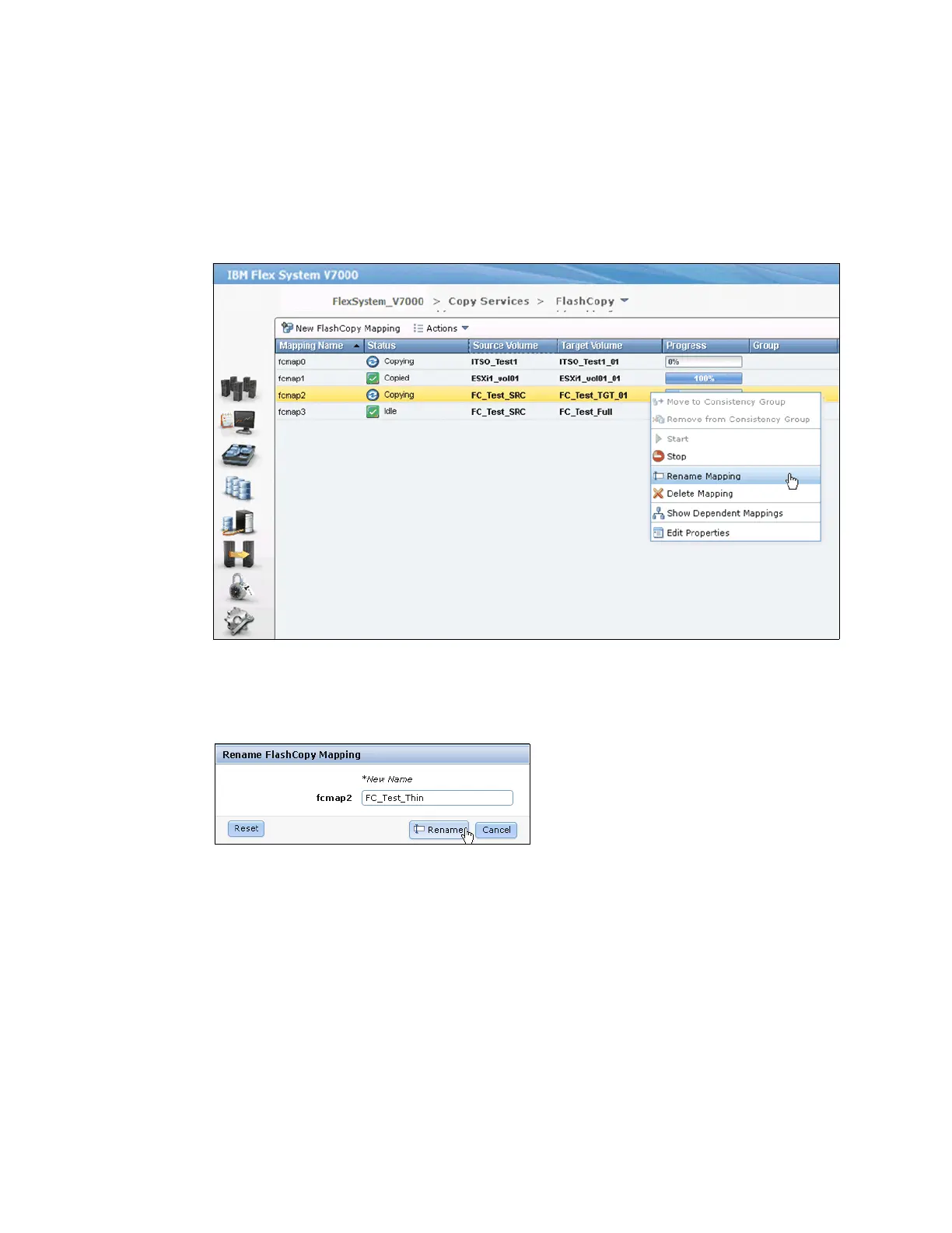 FlashCopy Mappings window and click the Rename Mapping option from the Actions