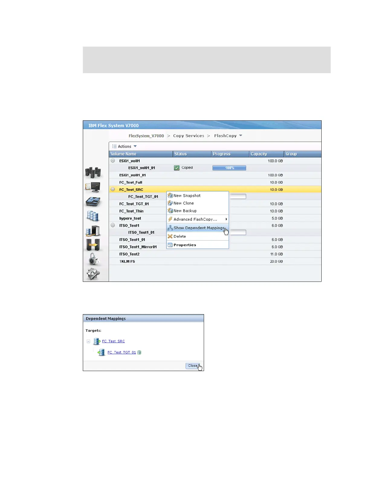 volume in the FlashCopy window and clicking the Show Dependent Mappings option from
