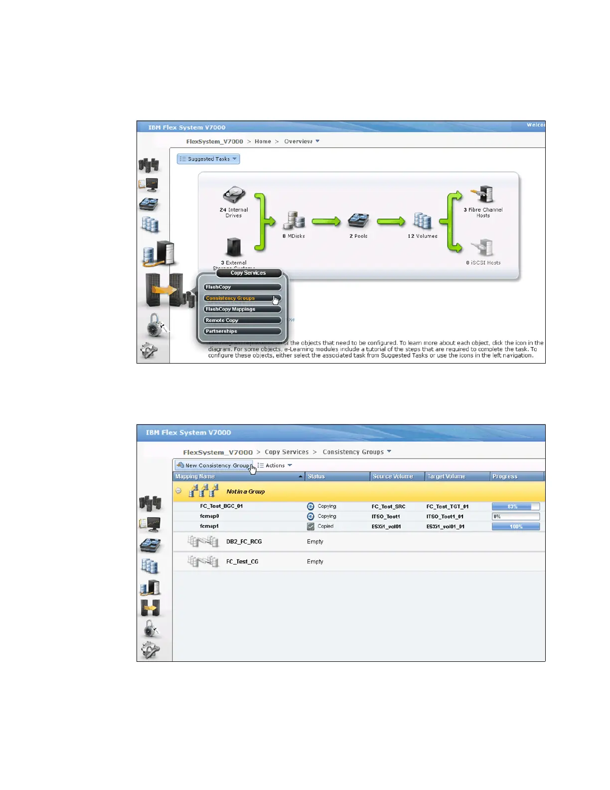 FlashCopy consistency groups can be managed by clicking the Consistency Groups menu