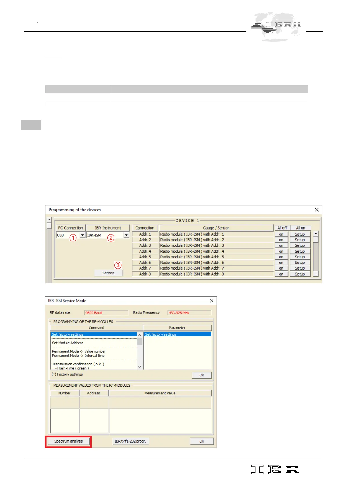 Please select USB as PC-Connection and IBR-ISM as IBR-Instrument. Then click the Service button to