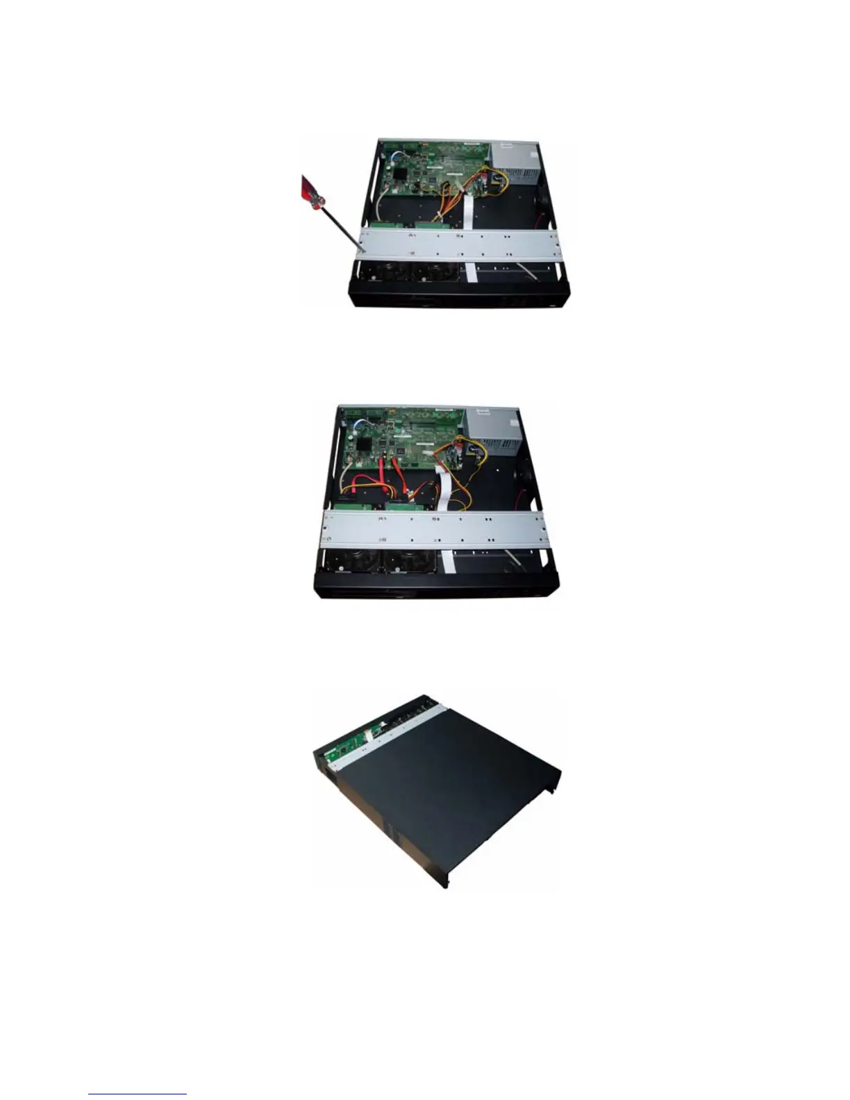 Please put the cover back and then fix the screws in the rear panel and the side panel. See