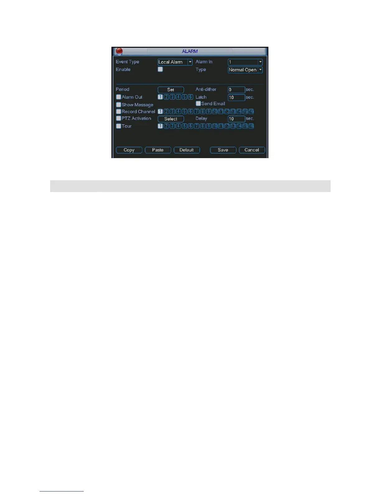 PTZ activation The corresponding PTZ operation (such as go to preset X) when alarm occurs.
