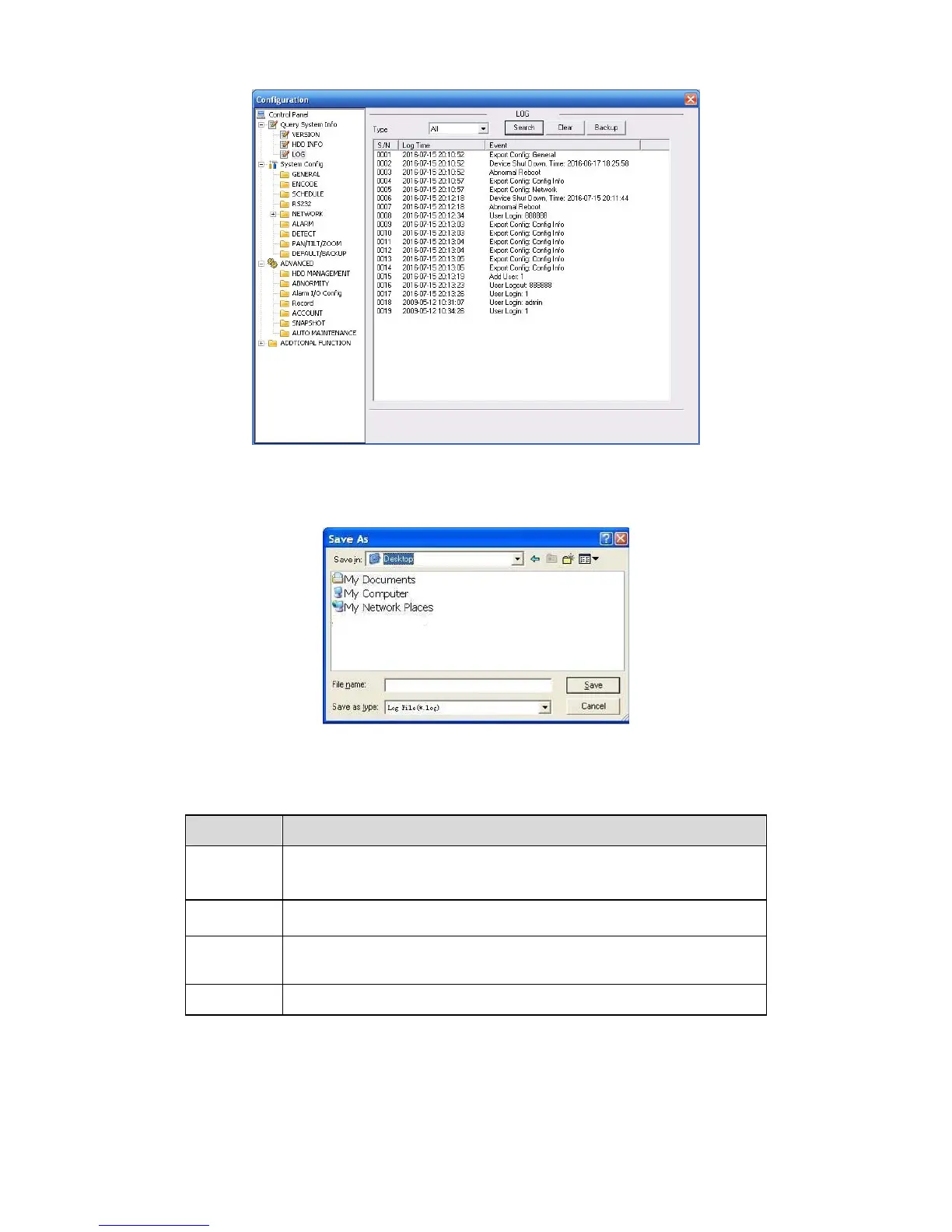 Clear You can click this button to delete all displayed log files. Please note
