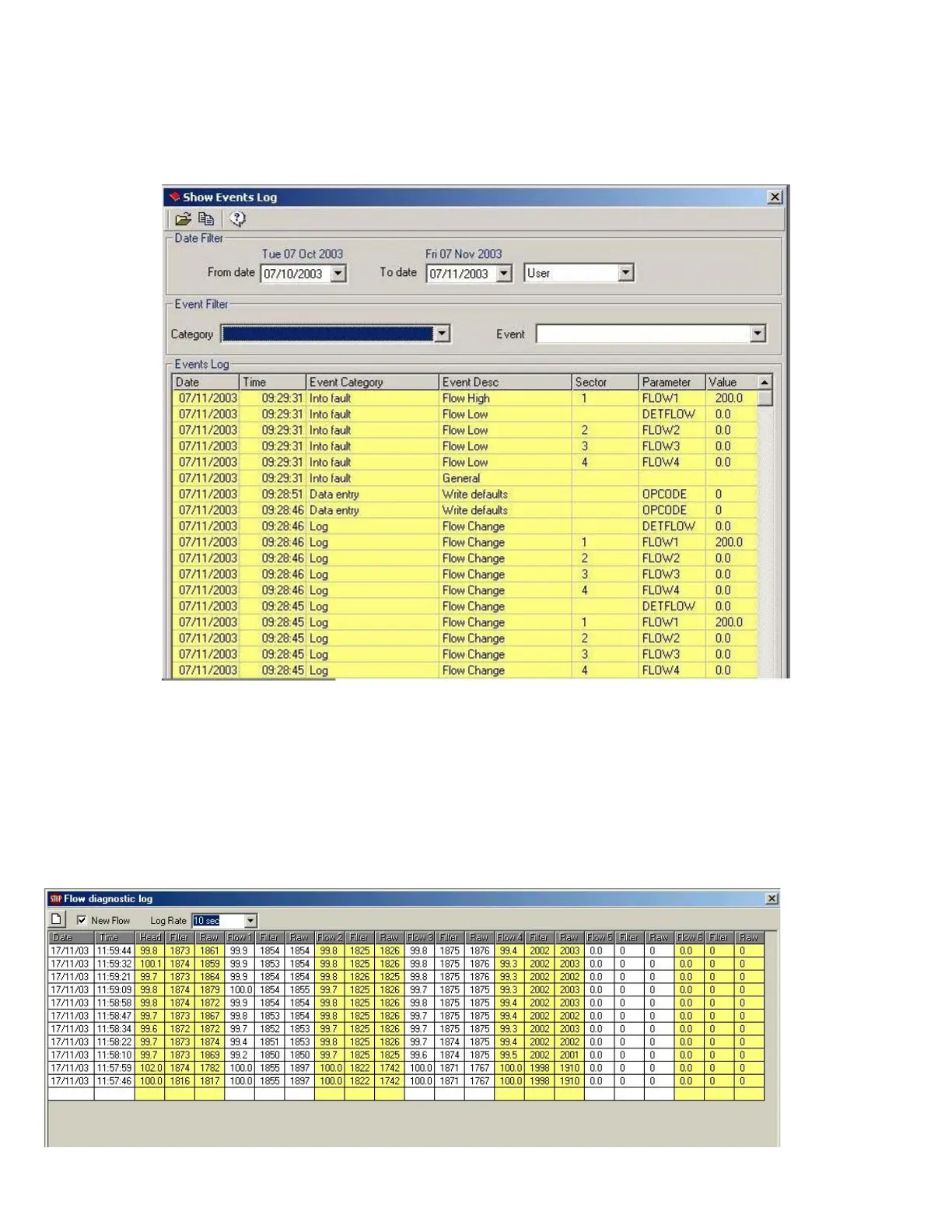 This table shows all the current flow rates for the detector and individual pipes. Raw data is taken before filtering. Filter values are taken