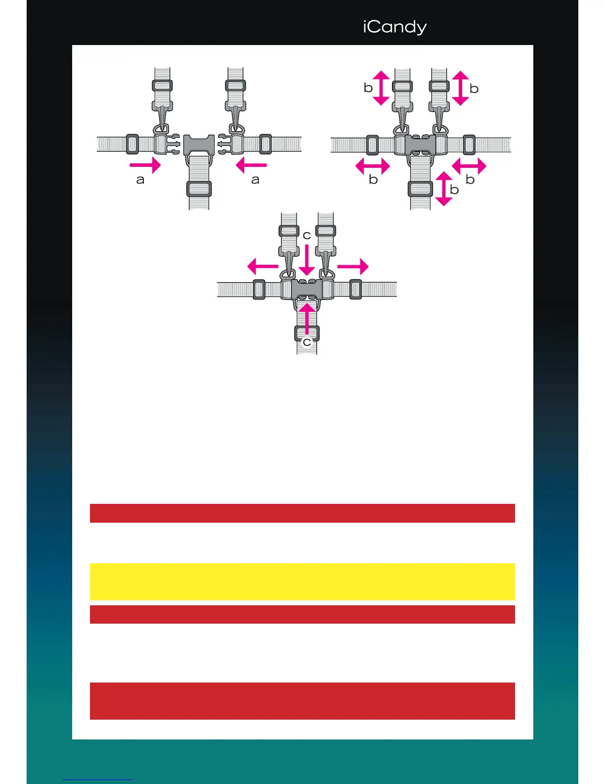 To release connectors: Squeeze the connectors inwards (c) and pull out of the buckle