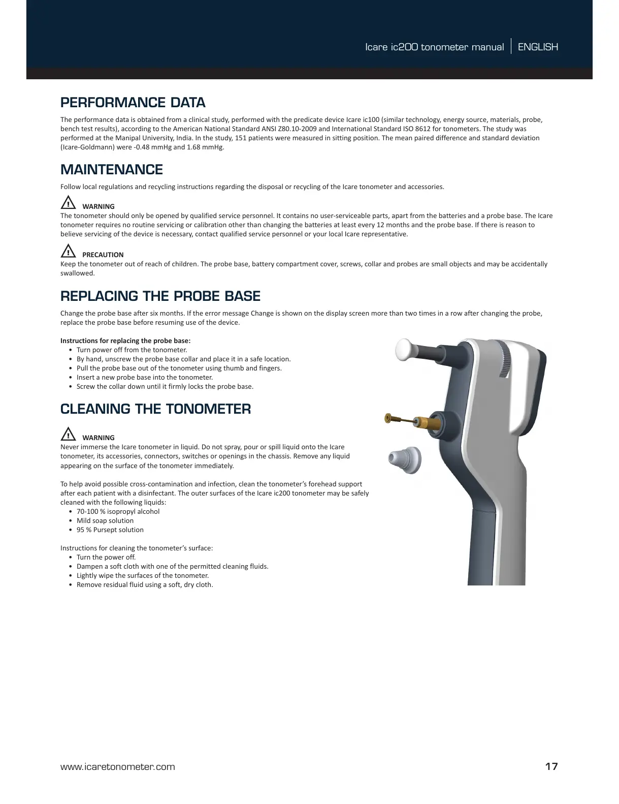 tonometer requires no routine servicing or calibration other than changing the batteries at least every 12 months and the probe base. If there is reason to