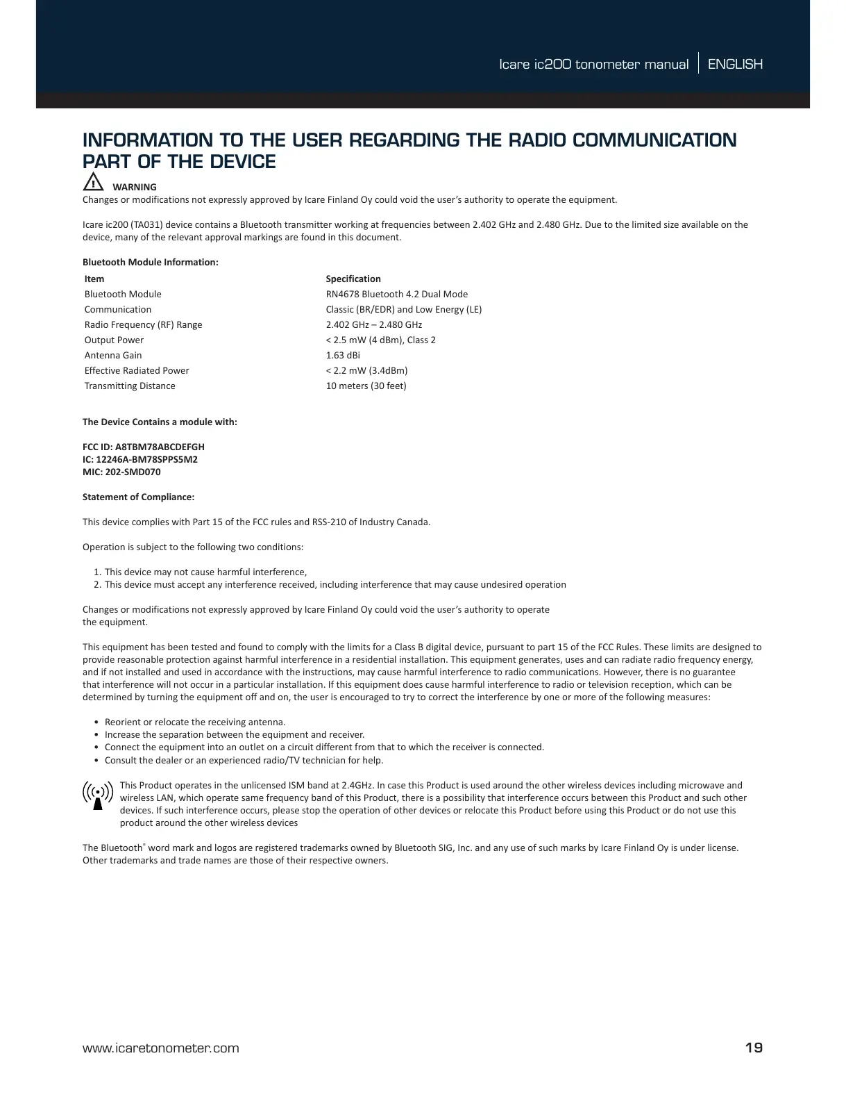 Icare ic200 (TA031) device contains a Bluetooth transmitter working at frequencies between 2.402 GHz and 2.480 GHz. Due to the limited size available on the