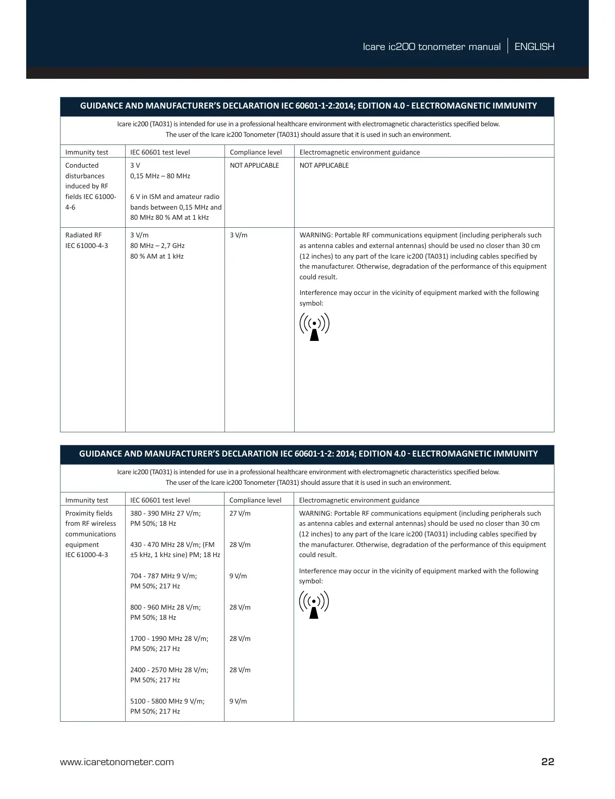 Icare ic200 (TA031) is intended for use in a professional healthcare environment with electromagnetic characteristics specified below.