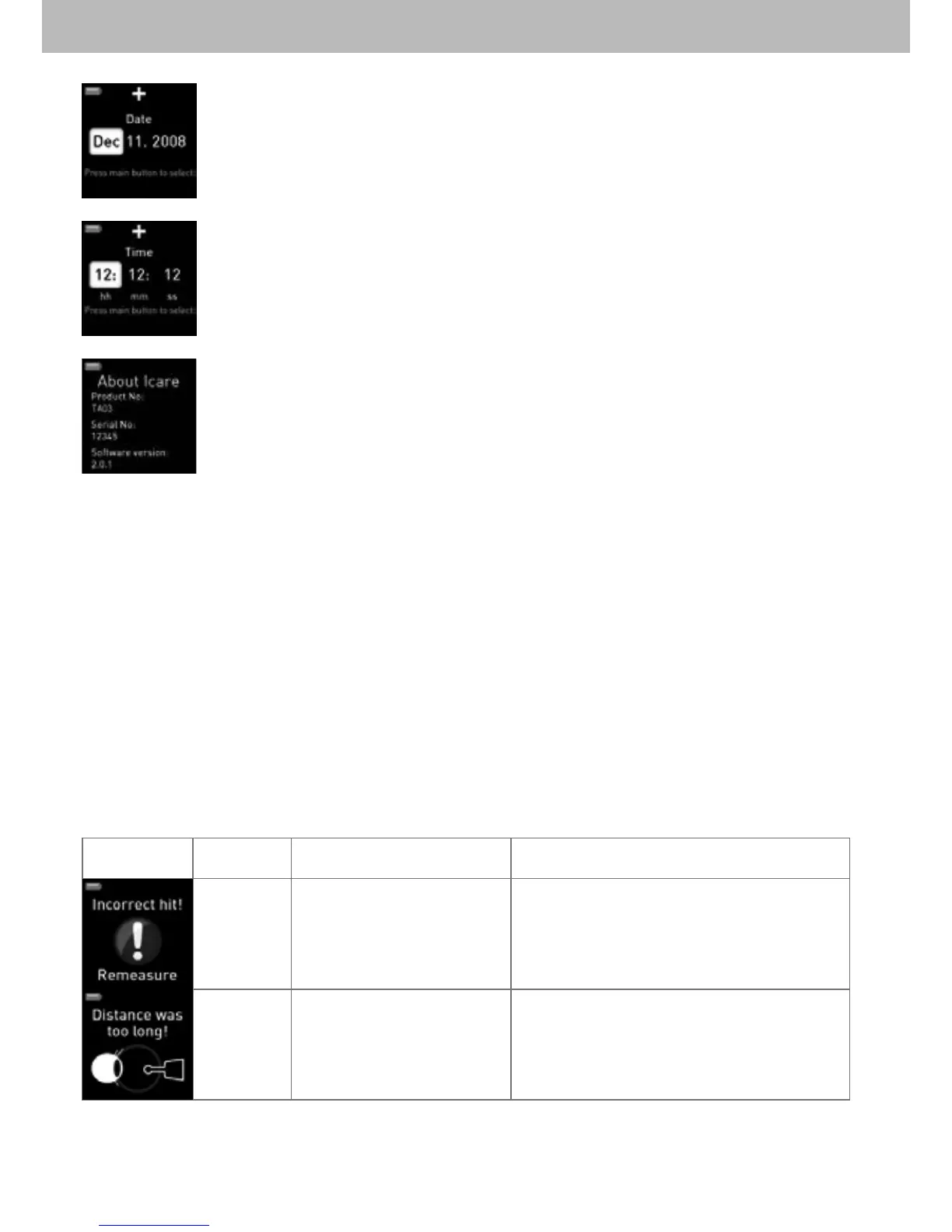 About (Info) – Zeigt die Seriennummer und die Softwareversion Ihres Icare PRO