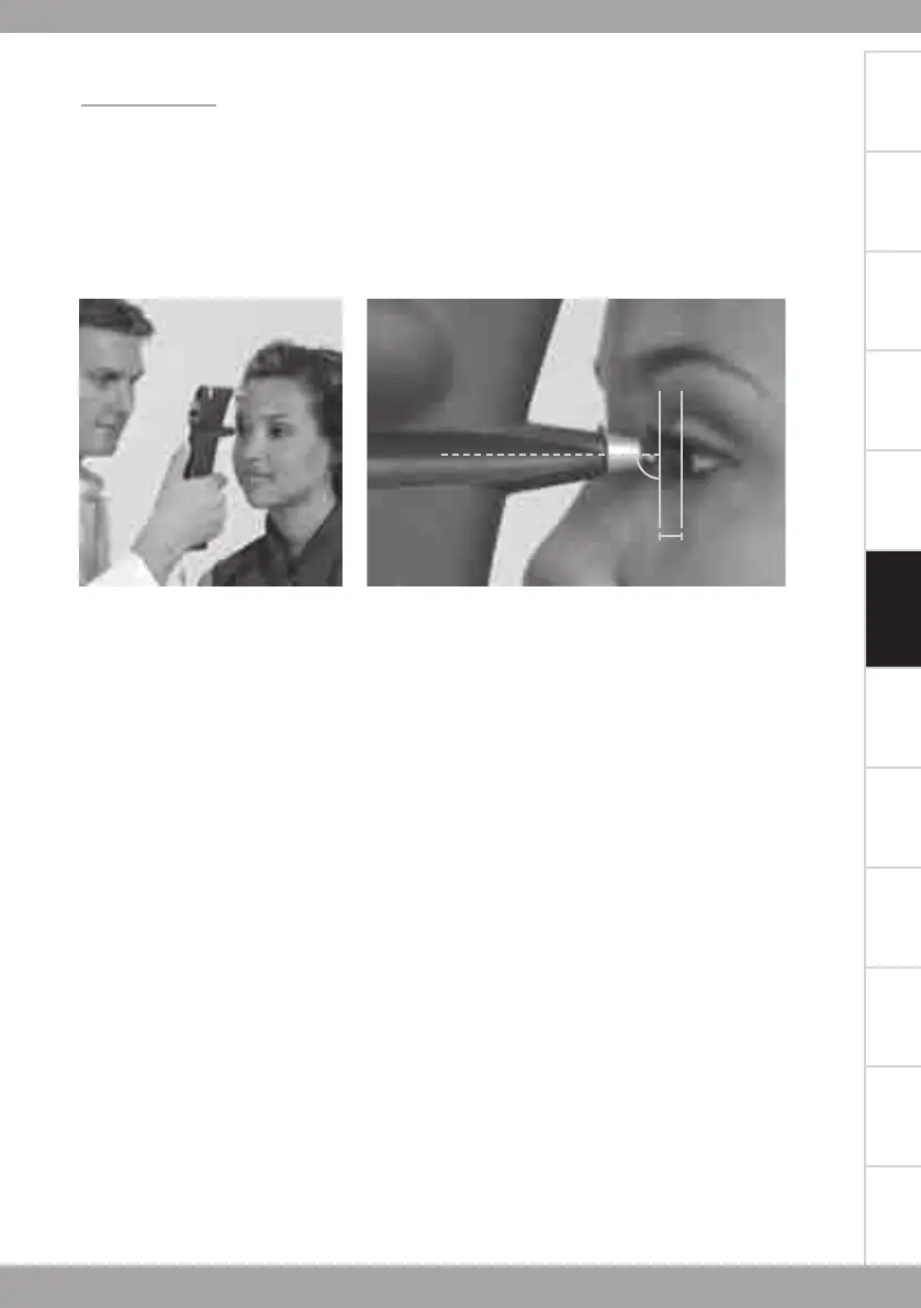 próximo ao olho do paciente. A canaleta central deve estar na posição horizontal e a distância do olho