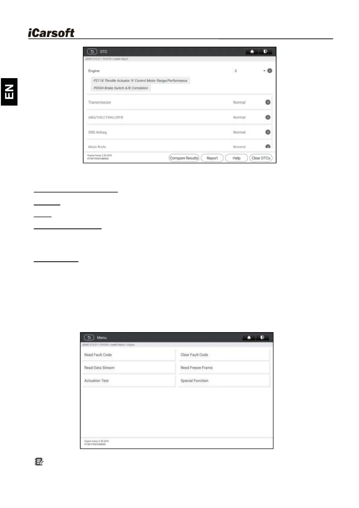 Report: Tap to save the diagnostic result as a diagnostic report in text format.