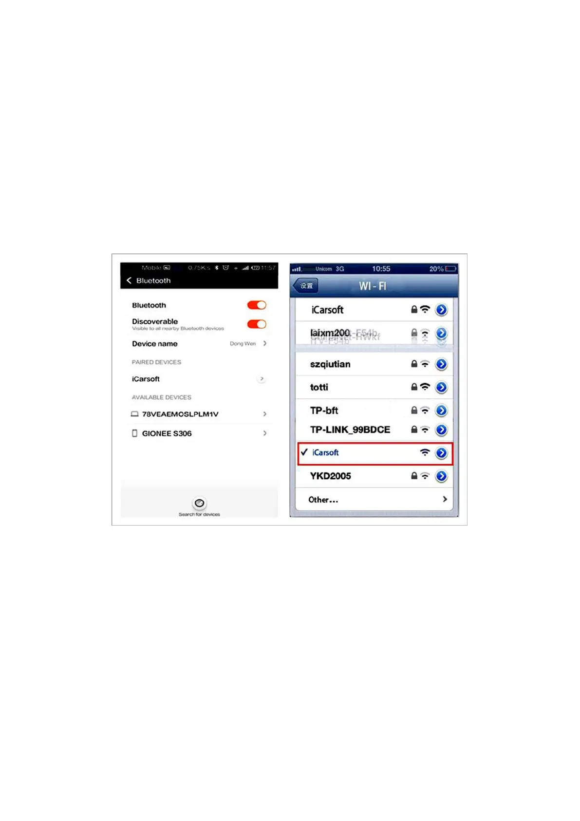 the ‘Bluetooth setting’ and scan the Bluetooth, choose ‘iCarsoft ‘and put the 1234 as