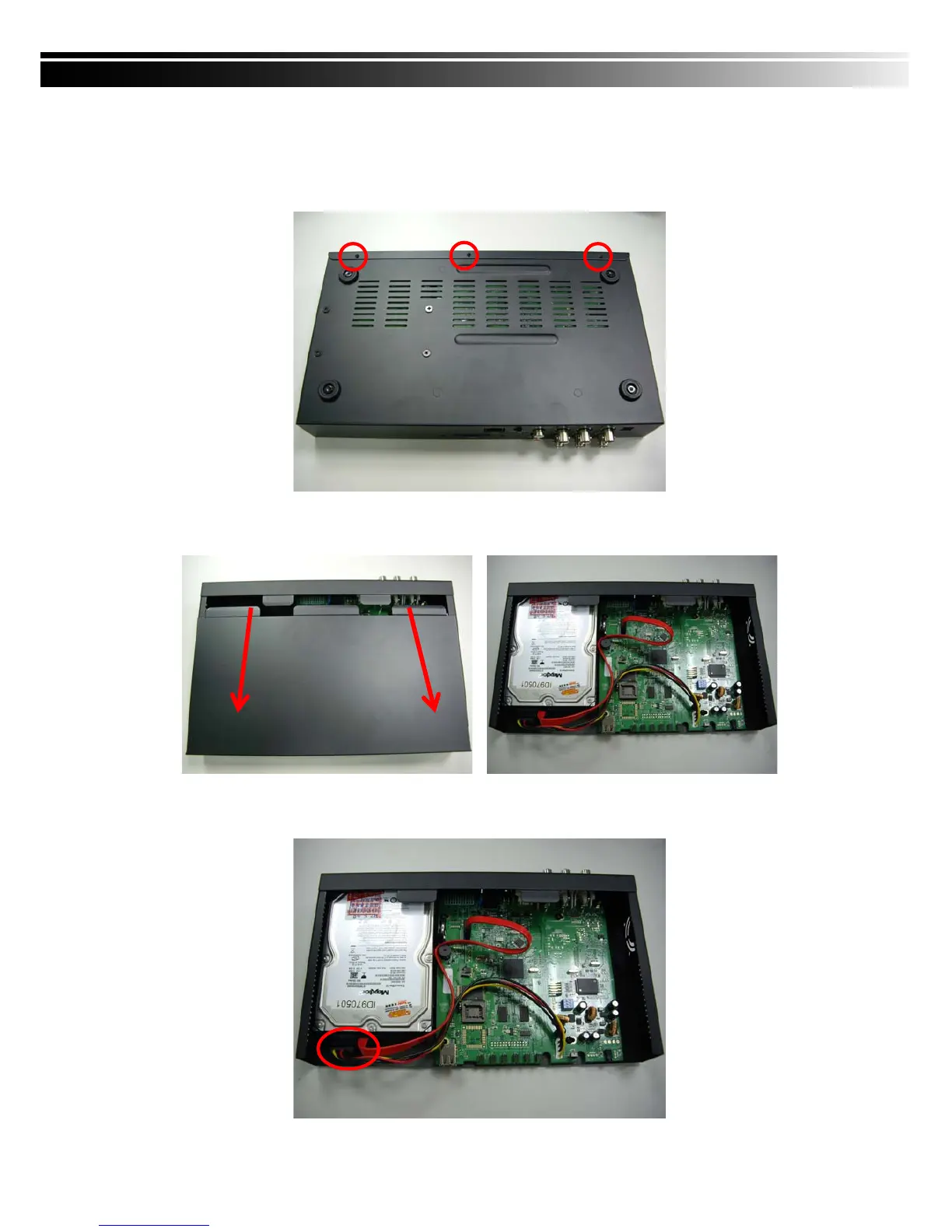 Step 1: Take off the three screws from the bottom of the DVR as indicated in red circles in