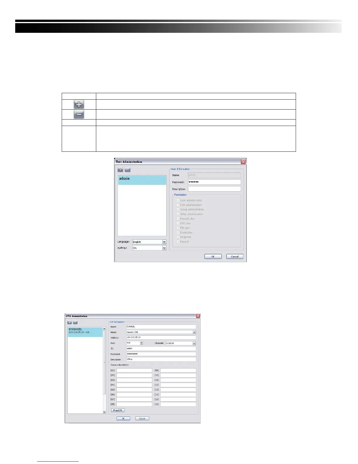 DVR connections can be added to or deleted from the CMS and their information can be edited.