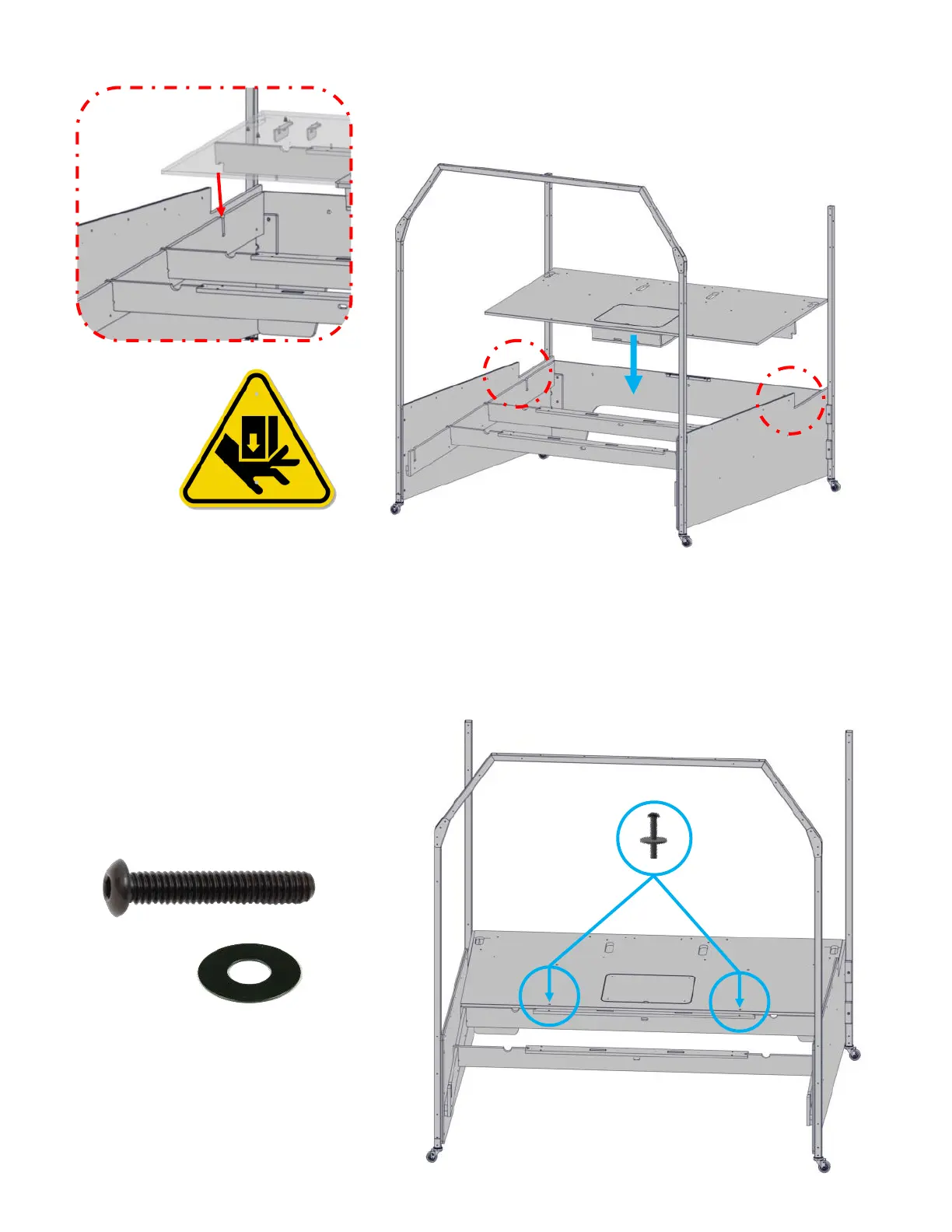 Secure the power sub-floor (1E) using two AA6584 black Allen bolts and AA6212 black washers.