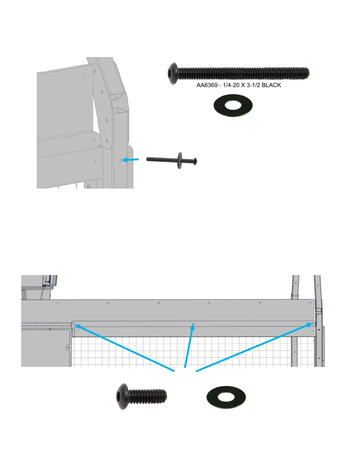 Secure the cage to the front cabinet legs using one AA6369 Black Allen Bolt and AA6212 black