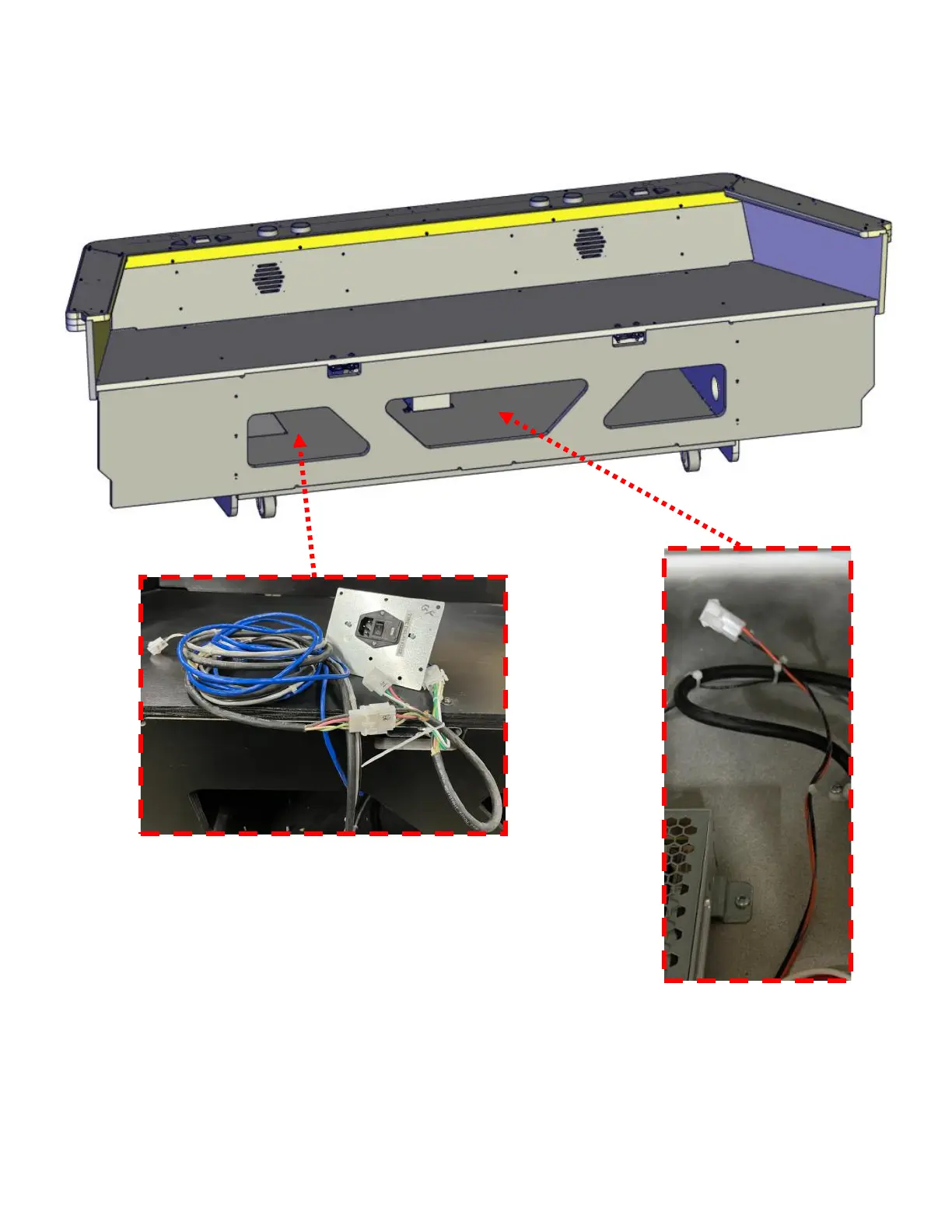 Undo harnesses at either end and push out side holes. The ball gate harness is accessed from the