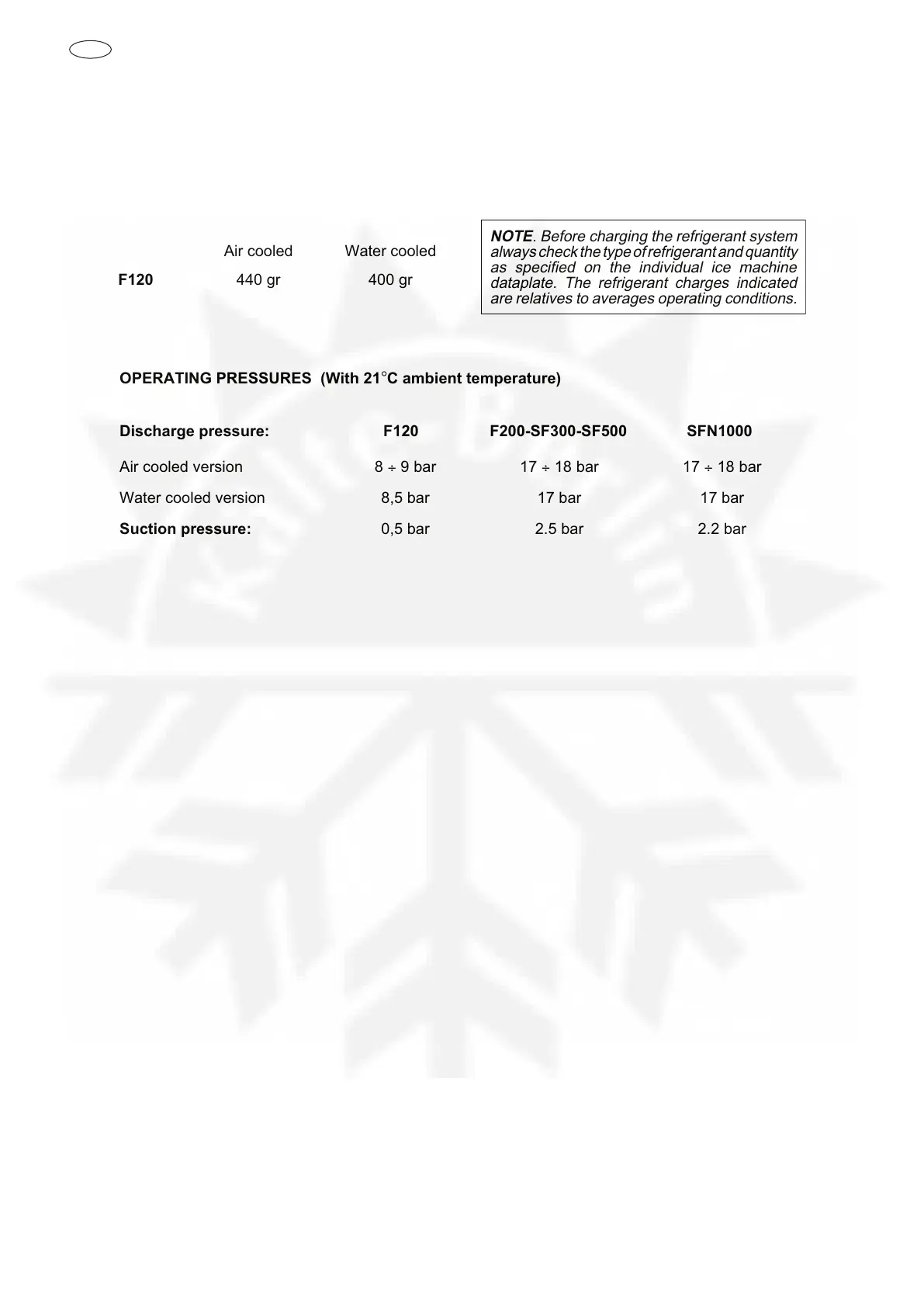 Icematic F 125 C - Operating Pressures