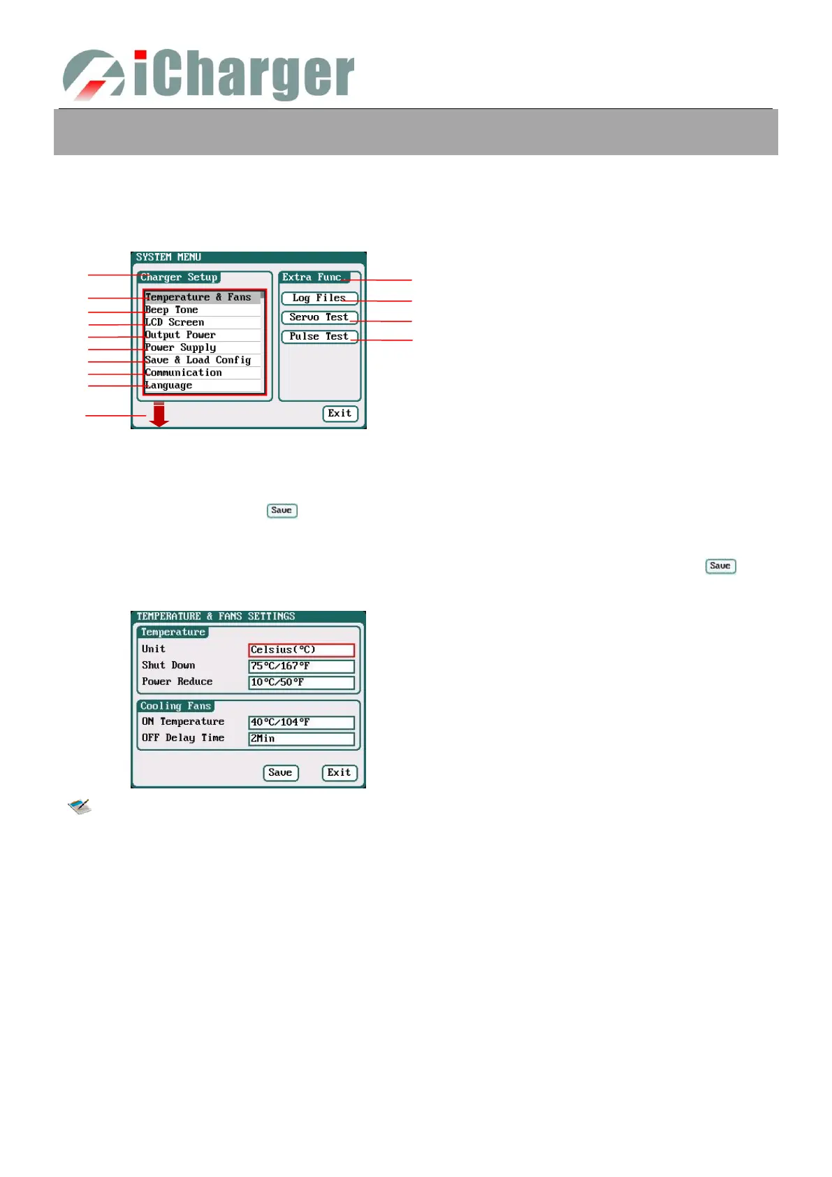 Select SYSTEM MENU→Charger Setup→Temperature&Fans to enter the setup interface, after setting click “ ”to