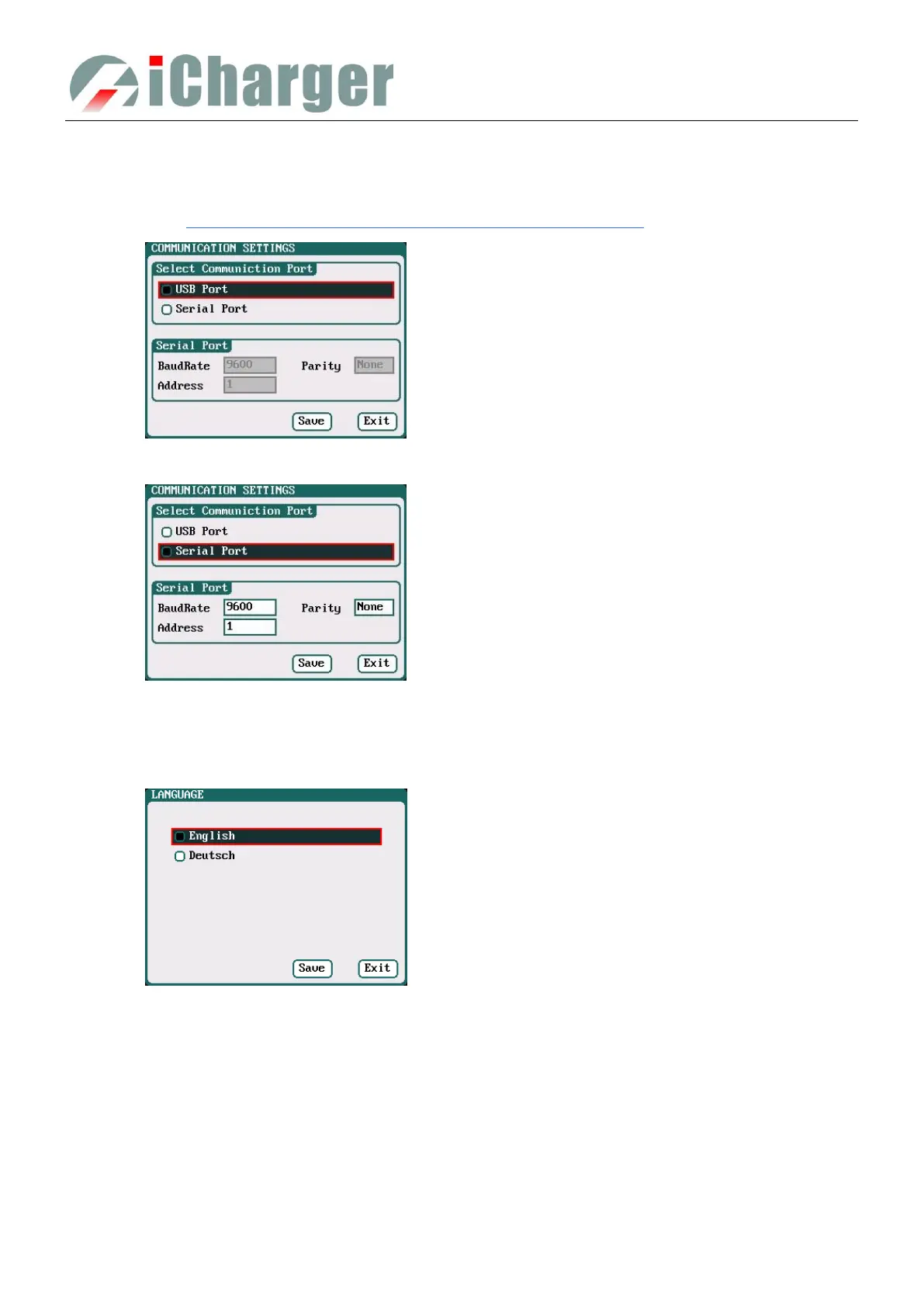 Select SYSTEM MENU→ Charger Setup→ Communication to enter the setup interface. See detailed information about