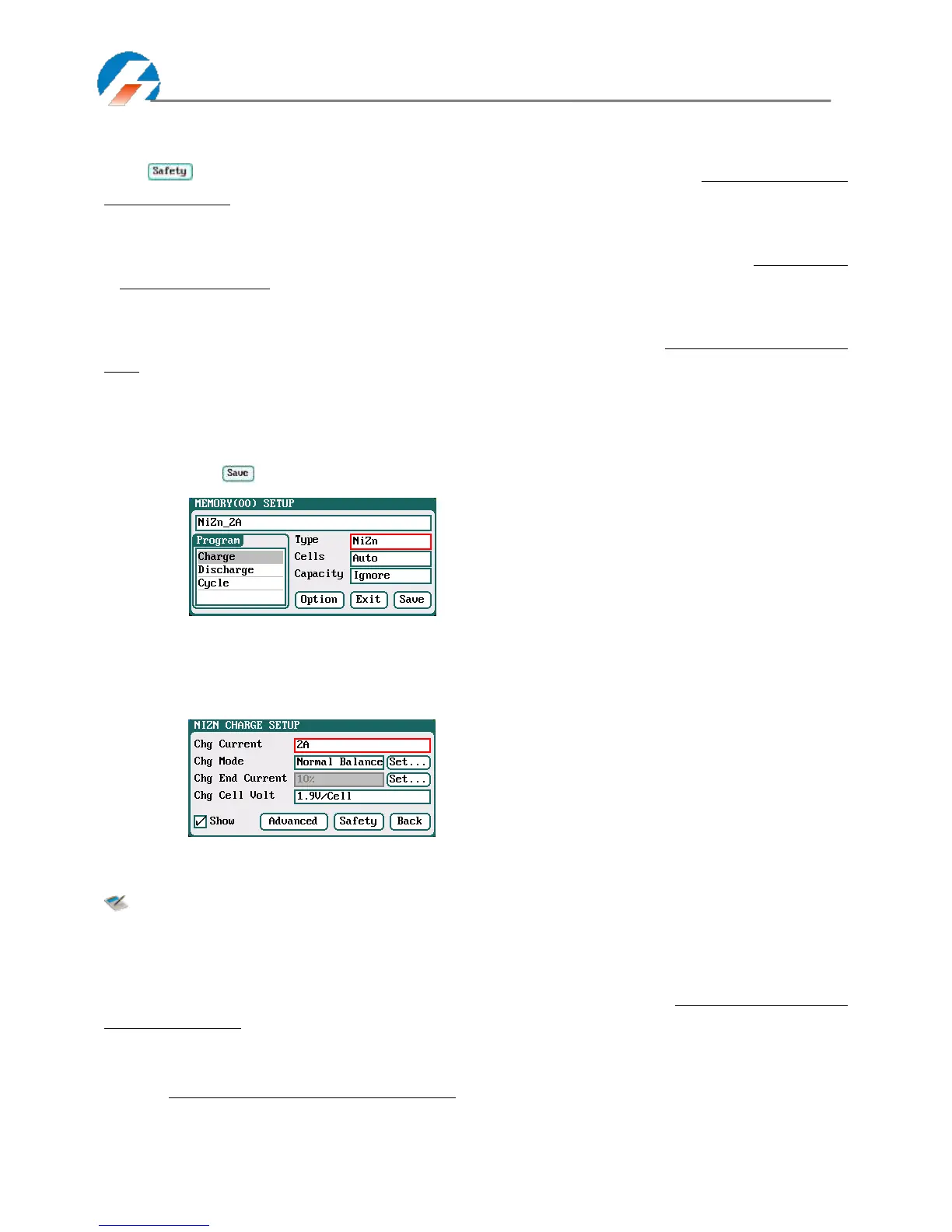 Click " " to enter CHARGE SAFETY SETUP interface, see details about setting on Page19 LiPo/LiIo/LiFe Battery