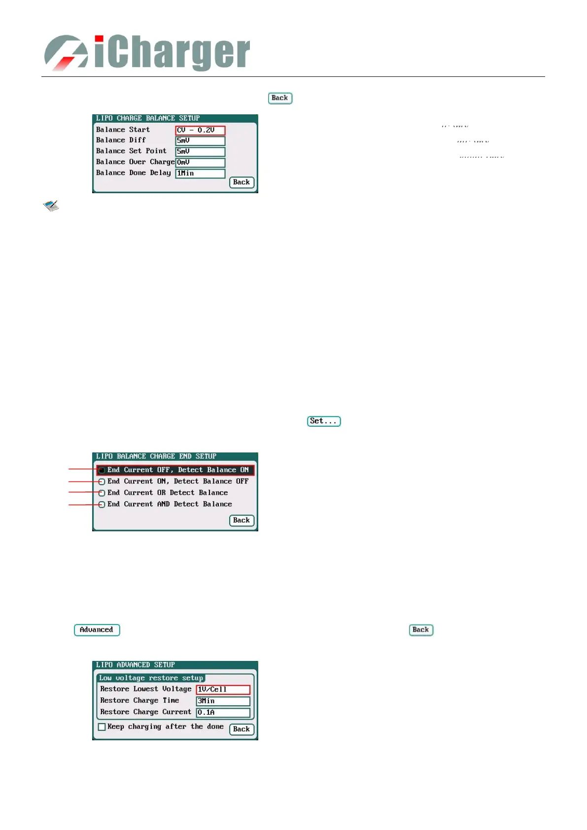 Click " " to enter LiPo/LiIo/LiFe ADVANCED SETUP, after setting, click" "to return to the previous