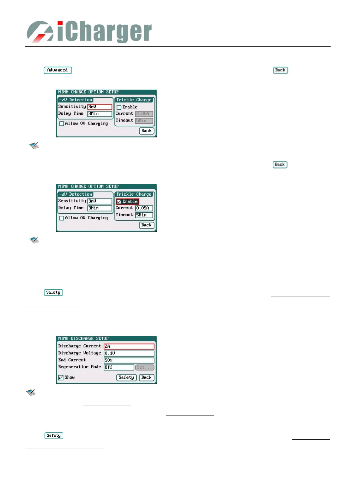 Click " " to enter NiMH/NiCd CHARGE OPTION SETUP interface, after setting click " " to return to the
