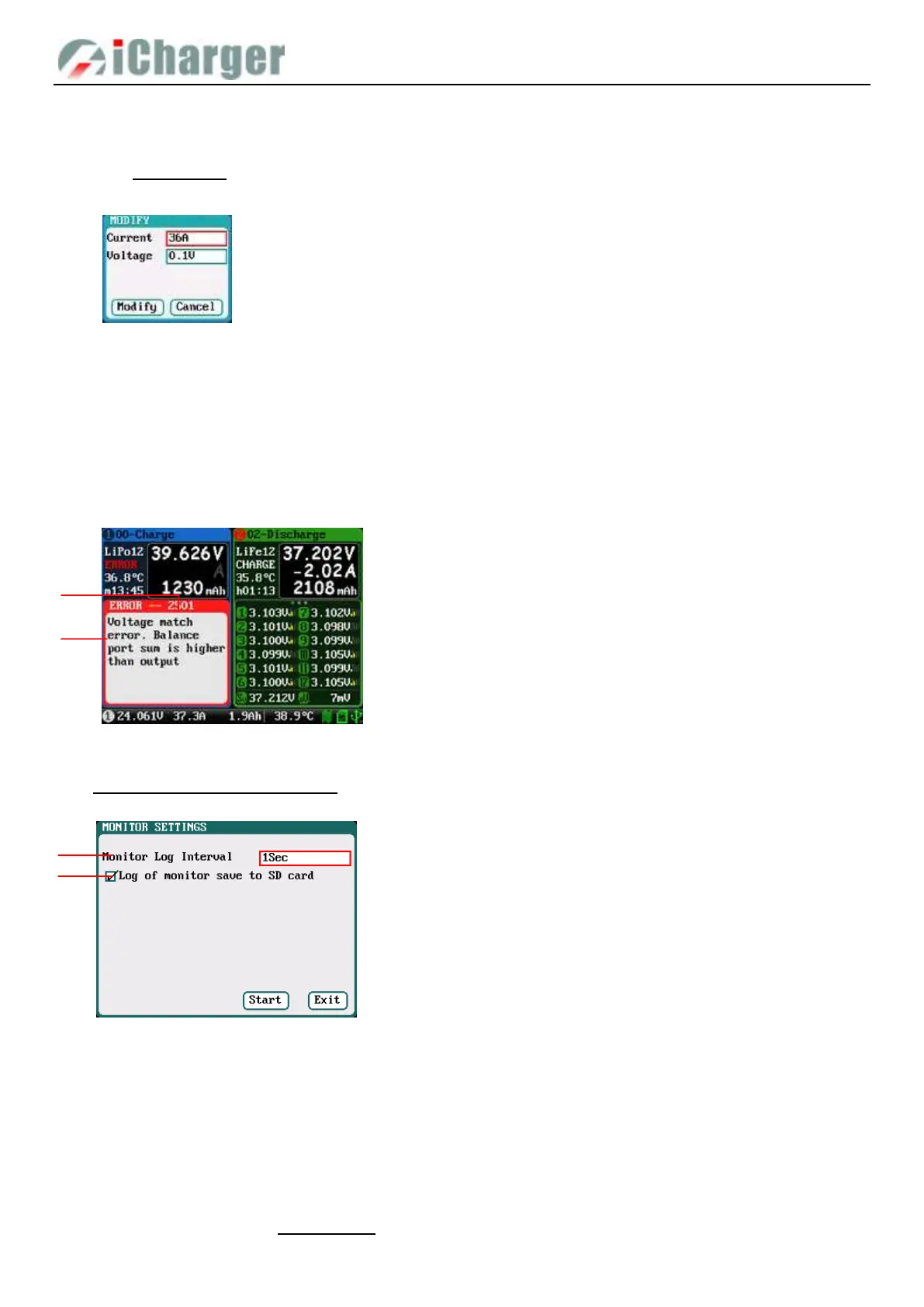 Long press <STATUS-x> button when running program to pop up MODIFY interface, to modify the current and discharge