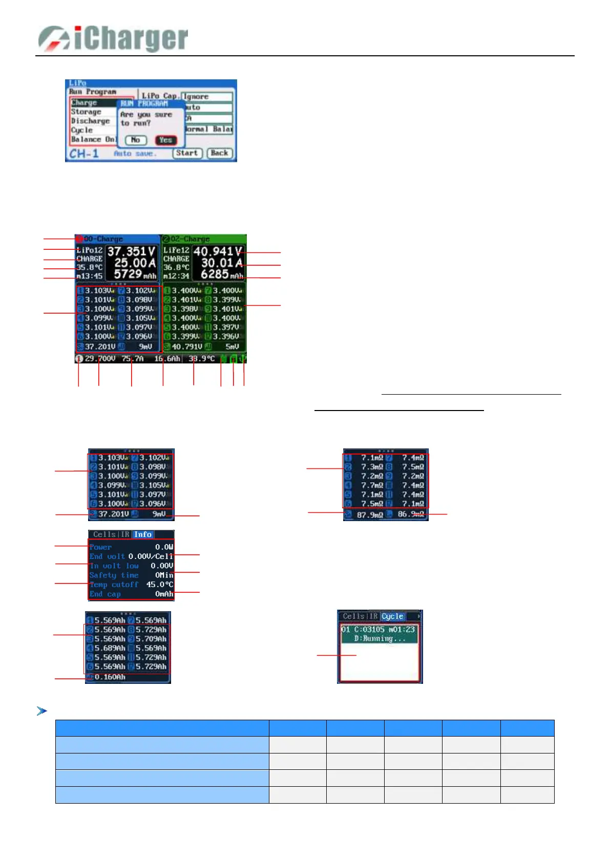 Different types of batteries and programs have different multipage information displays, see details below: