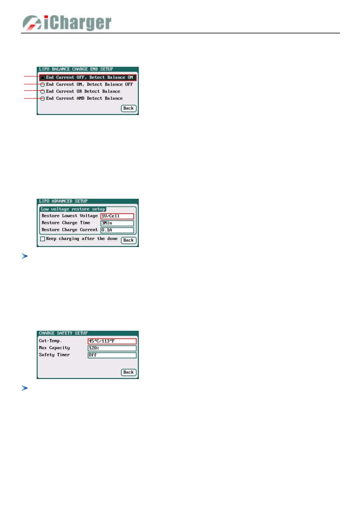 Click "Advance" to enter LiPo/LiIo/LiFe ADVANCED SETUP, after setting, click "Back" to return to the previous