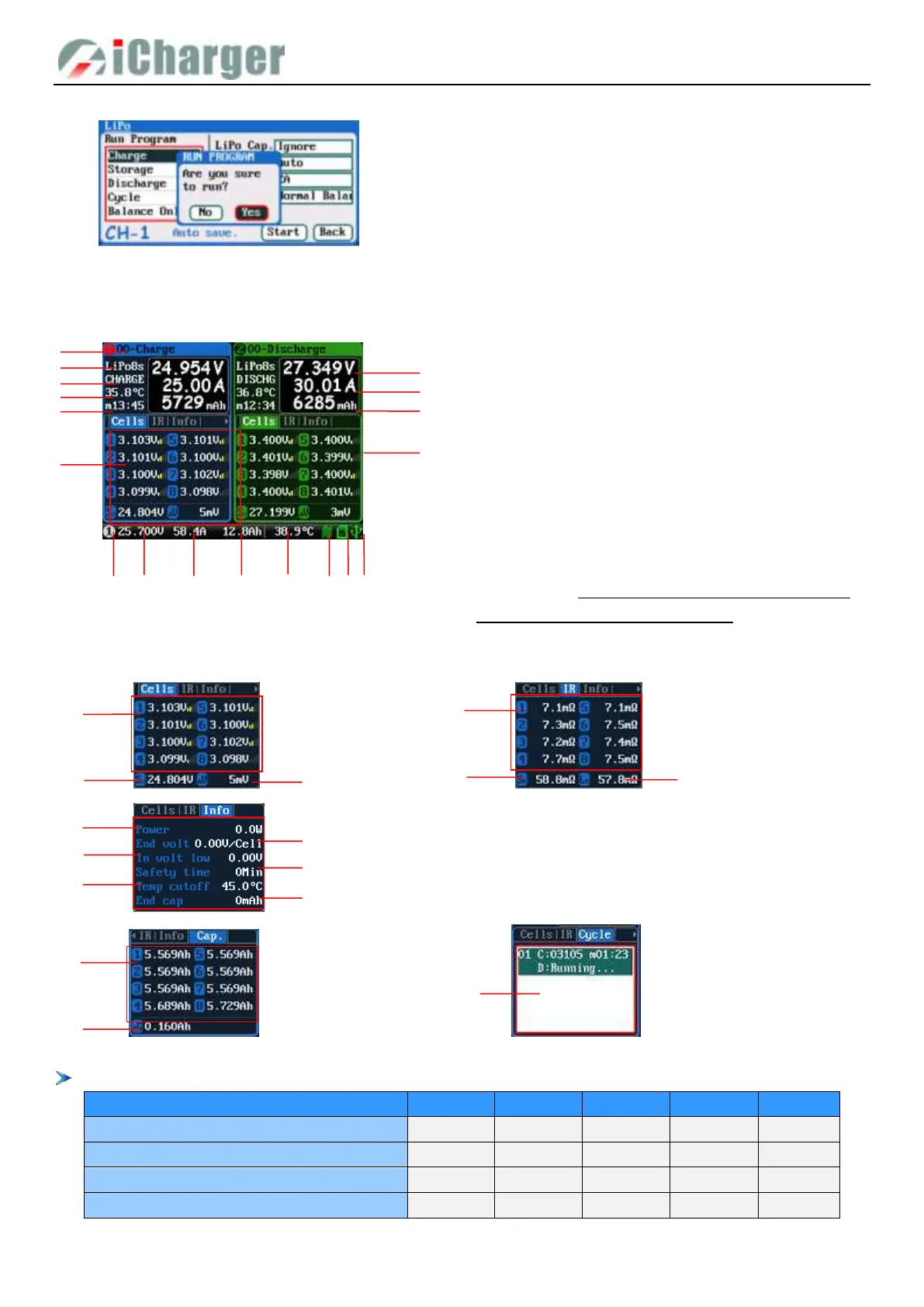 Different types of batteries and programs have different multipage information displays, see details below: