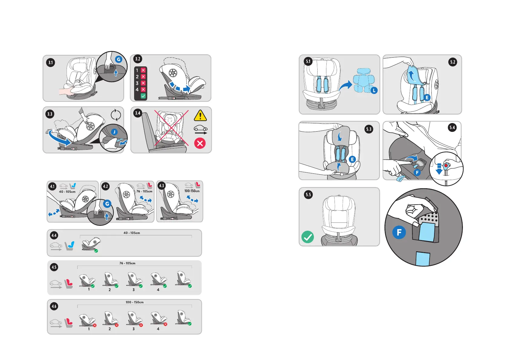 buckle (F) in the base of the seat preparing it for 100-150 cm in height.