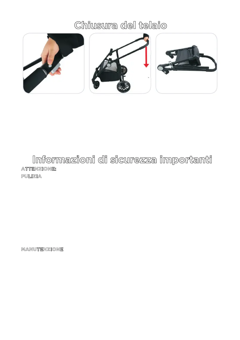 • Interrompere l'uso del passeggino in caso di danni o malfunzionamenti.