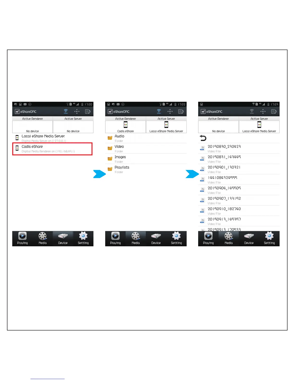 ICODIS CB-200 - DLNA Connection Steps; Select Renderer & Media server; Select file then play; Play via projector