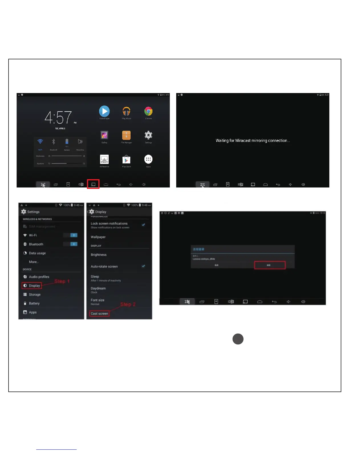 2. Turn on Miracast function on your smart Android 4.4.2 version and above phone or tablet PC