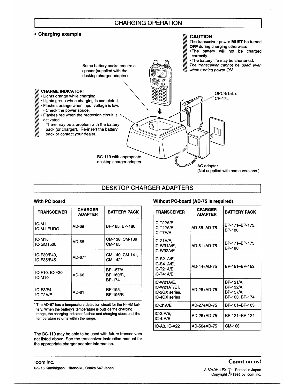 Icom BC-119 - Charging Operation and Indicators; Charging Precautions; Charge Indicator Status