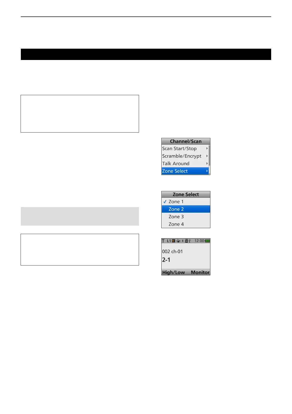 (Menu > Channel/Scan > Zone Select)