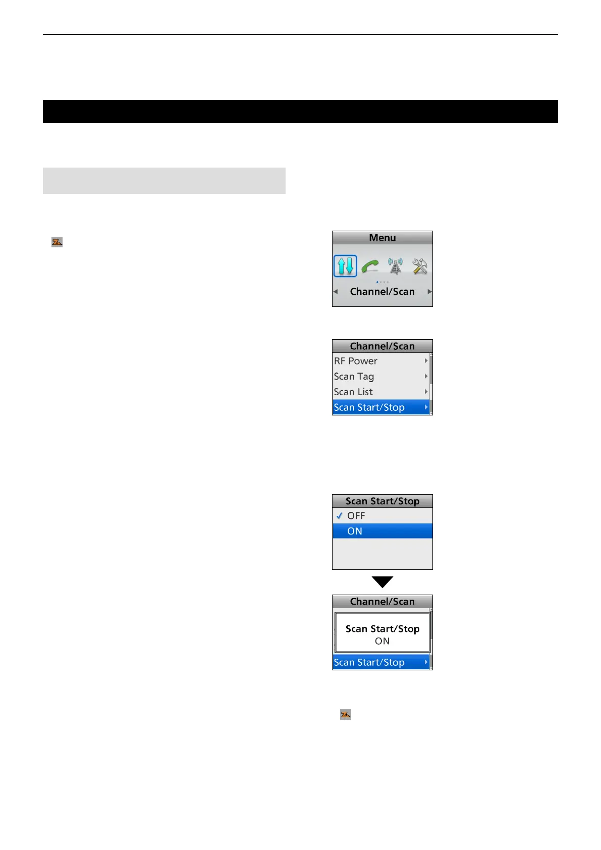 (Menu > Channel/Scan > Scan Start/Stop)