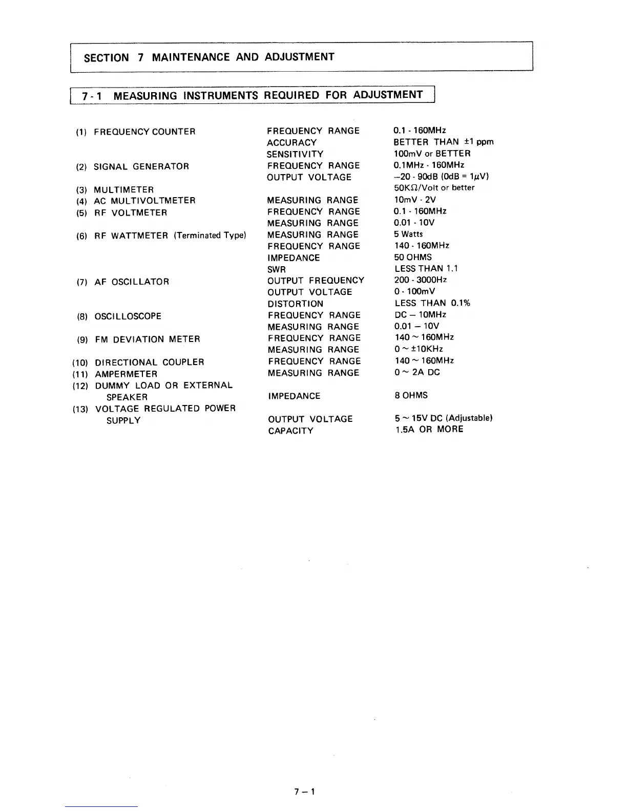 Icom IC-02AT - SECTION 7 MAINTENANCE AND ADJUSTMENT; Measuring Instruments and Preliminary Checks