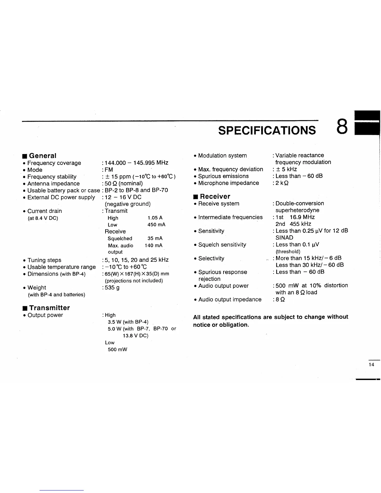 Icom IC-02N - Specifications; General Specifications; Transmitter Specifications; Receiver Specifications